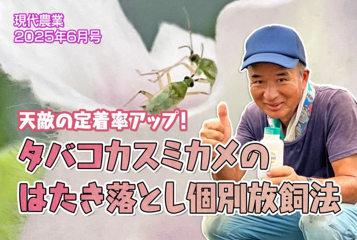 土着天敵タバコカスミカメは、害虫のアザミウマ(スリップス)などを食べてくれる、ありがたい虫。でもねらった株に定着させるには工夫が必要…。そこで鹿児島県のピーマン農家・下前泰雄さんが実践する「はたき落とし個別放飼法」を見せてもらいました。成虫ではなく、まだ飛べない幼虫を活用することがミソのようです。