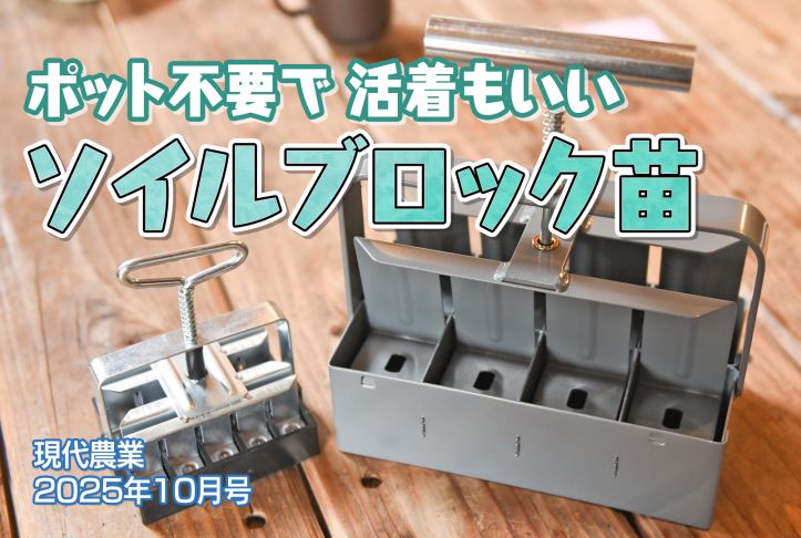 三重県の(公社)全国愛農会の菜園では、苗ものの一部にソイルブロック苗を使っています。ソイルブロックとは育苗培土を押し固めてブロック状にしたもの。ポット不要で、根巻きせず、活着のよい苗ができるそうです。今回はソイルブロックメーカーを使うところを見せてもらいました。